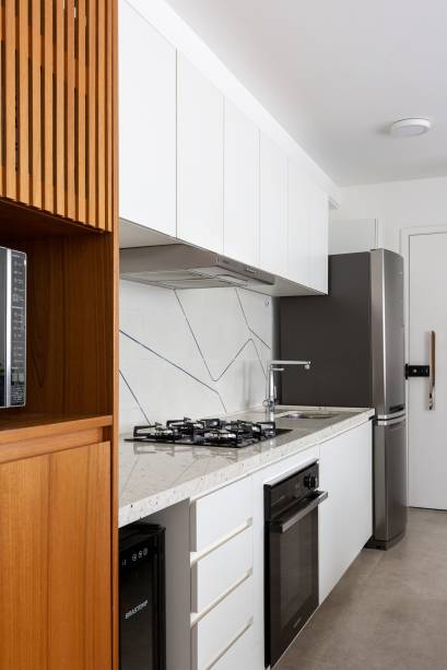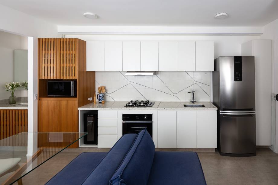 A cozinha funciona de forma linear, aproveitando toda a largura da área social, espaço reforçado pelo perfil de led embutido acima dos armários, no duto de passagem de infraestrutura e compondo uma das diferentes opções de ambientações propostas pela iluminação do apartamento.