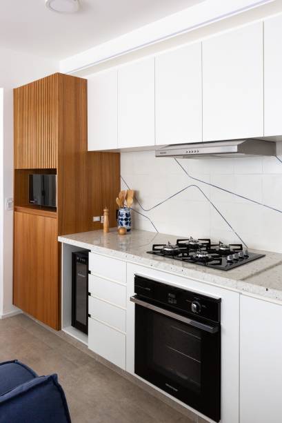 Por outro lado, a leveza na materialidade é apresentada nas bases neutras, nas chapas metálicas brancas e tampo de vidro, aliada ao conforto e certa rusticidade de alguns materiais, como os ladrilhos hidráulicos da bancada da cozinha e do banheiro, a madeira tauari da marcenaria e o tecido de algodão do sofá.