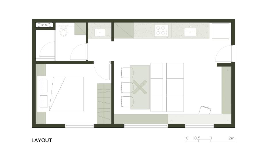 A área de estar, jantar e cozinha foi ampliada, criando um espaço integrado. O sofá, elemento importante de organização para o espaço proposto, foi desenhado com dois lados de assentos, onde o lado mais profundo atende à parte da TV e o lado menos profundo funciona como assento para a mesa de jantar.