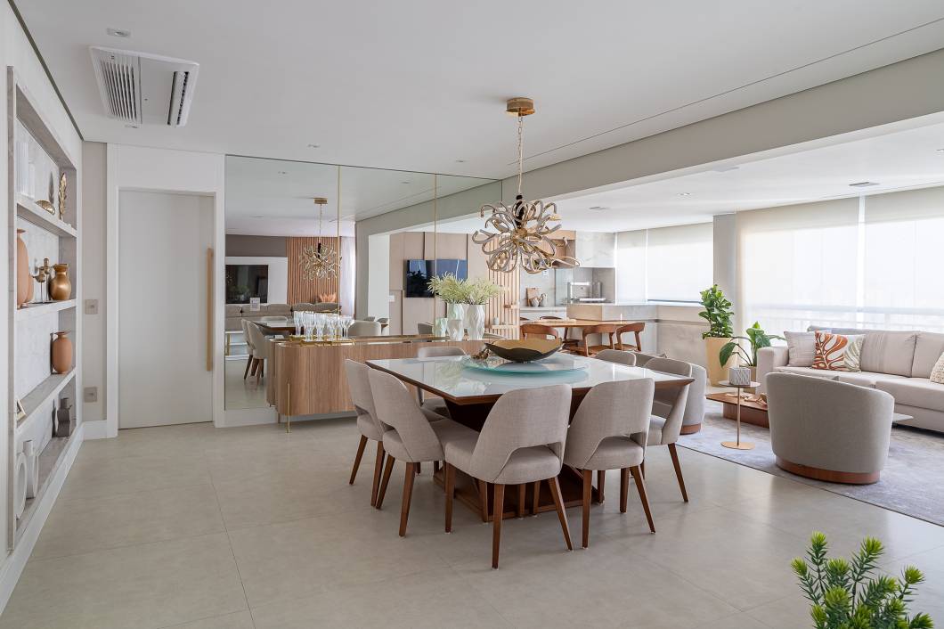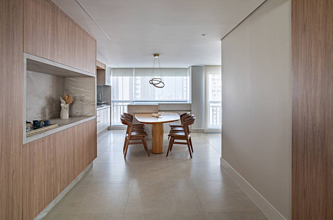 Destaque para a mesa orgânica na varanda desenhada pelo escritório e desenvolvida pelo marceneiro da obra em madeira maciça. Como é o cômodo mais utilizado pela família, o design traz fluidez para o ambiente sem perder a elegância e a praticidade. O buffet ao lado serve de apoio e armazena os aparelhos de jantar.