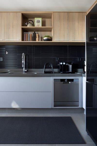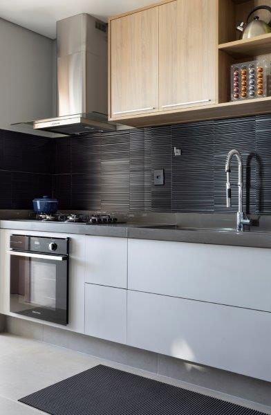 “O design da marcenaria foi elaborado pensando em linhas retas e contínuas, com puxadores embutidos na própria peça, dando uma sensação de linearidade nos móveis”, afirma o escritório.