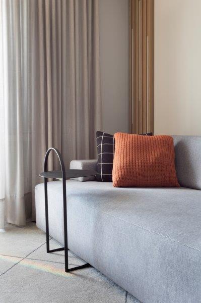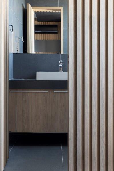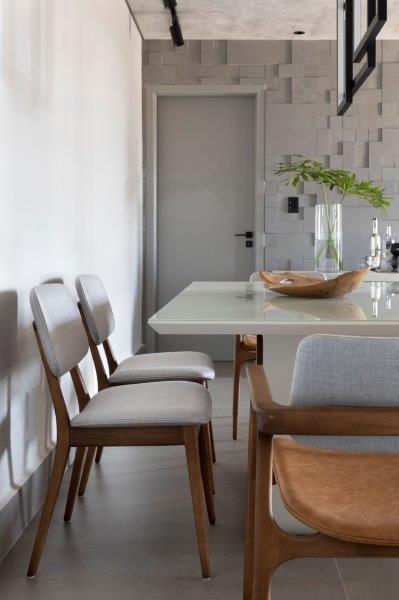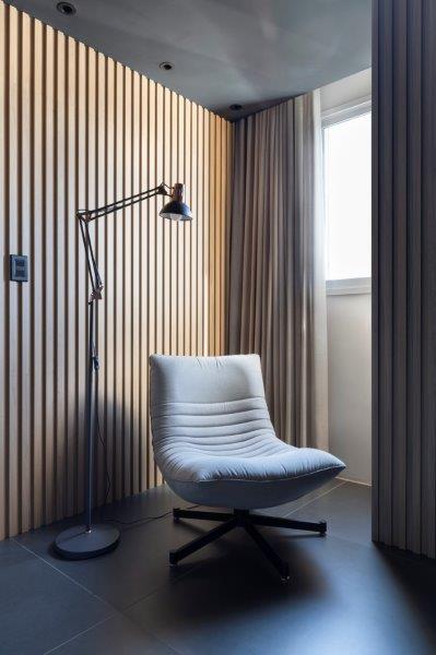 Na área íntima, estão a suíte home office, cujo ponto focal é a estante que possui um ripado em madeira e divisórias que camuflam o ar condicionado. E na suíte máster, os créditos ficam para a cabeceira para a cama turca.