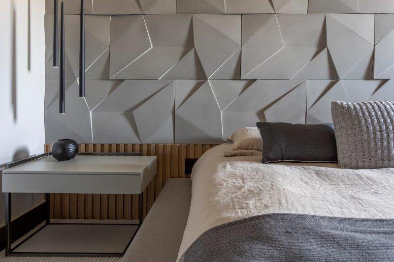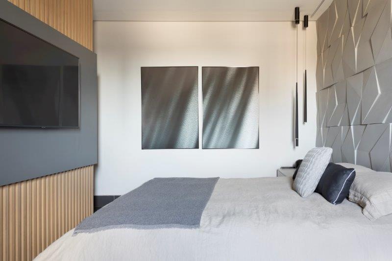“De todos os cômodos, o que mais me surpreendeu foi a suíte máster, mesmo a sua estética sendo formada por painéis ripados e cabeceira em pedra, o ambiente foi capaz de trazer leveza e aconchego.”