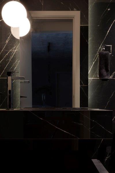 No living, os profissionais ressaltam dois destaques: a parede com revestimento e a estante em alumínio preto com vidro. Já no lavabo, as cores sóbrias são destaque, ressaltando a cuba esculpida com porcelanato.
