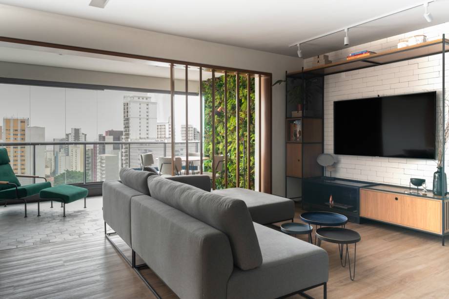 Um dos pedidos era que a sala de TV, considerada o coração da casa, fosse um espaço aconchegante. Por isso, os arquitetos projetaram uma estante unindo 3 materiais: serralheria, madeira e pedra. Este móvel abriga a TV e uma lareira ecológica que traz ainda mais conforto para o ambiente.