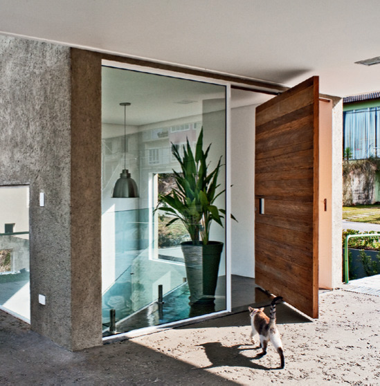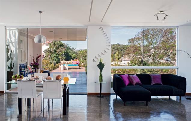 Não foi necessário convencer os proprietários de que a solução ideal seria respeitar ao máximo a topografa do solo e construir abaixo do nível da rua, distribuindo os ambientes em três pavimentos. “Eu e meu marido sabíamos que mexer demais na terra custa caro”, revela a doutora em engenheira aeronáutica Aline Capella. “Seguir à risca o projeto executivo, que especifca inclusive o tipo de papeleira do banheiro, também ajudou a conter gastos”, completa ela. A preocupação em deixar a casa confortável, com ambientes iluminados e arejados, se traduz nas aberturas envidraçadas determinadas após um estudo minucioso da incidência do sol e dos ventos. “A vista para o entorno arborizado do bairro e os jardins que pontuam a morada toda evitaram áreas monótonas”, acrescenta Frederico.