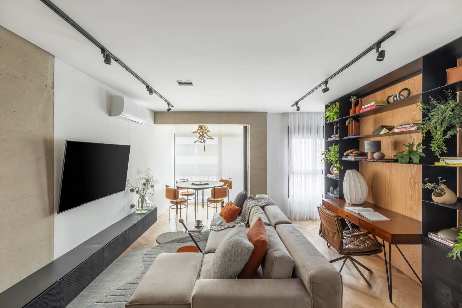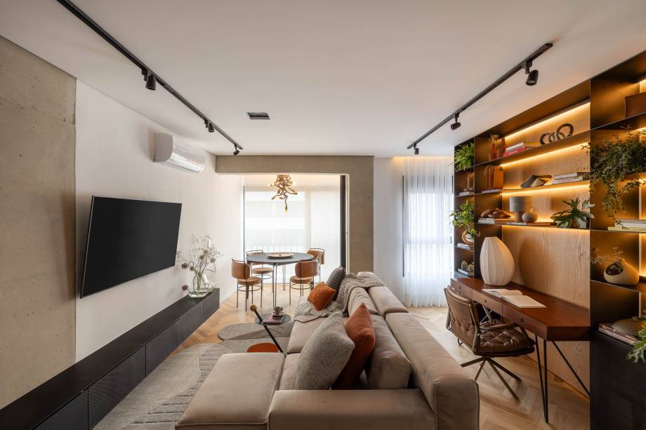 O escritório também criou uma peça multifuncional em serralheria com chapa metálica perfurada, que se inicia próximo à entrada, como sapateira, passa pelo living como apoio para a TV e termina no jantar sendo aparador.