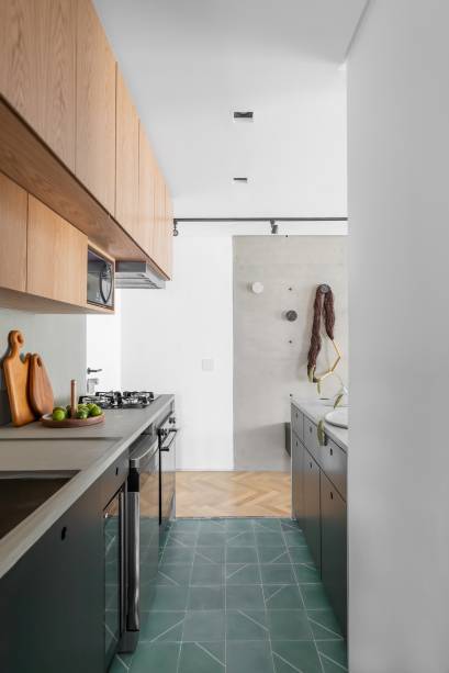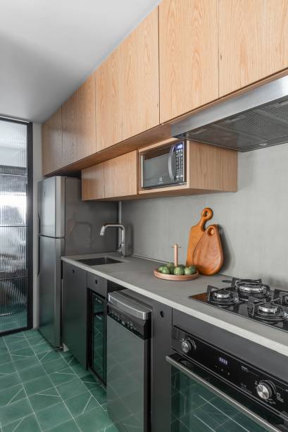 Já as bancadas da cozinha, também em concreto, reforçam a atmosfera industrial. O piso em ladrilho hidráulico nas áreas da cozinha e de serviço traz cor e o aspecto artesanal.