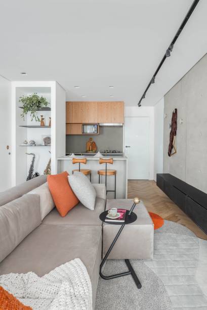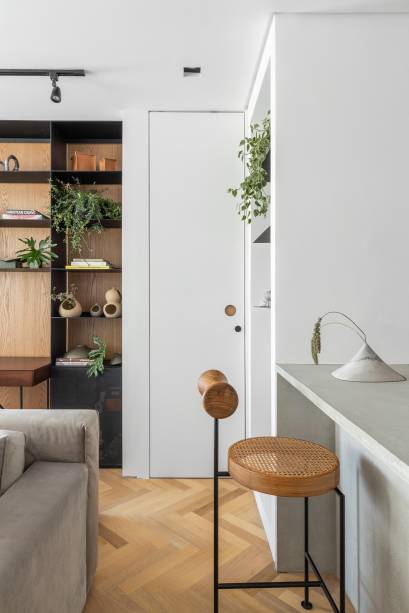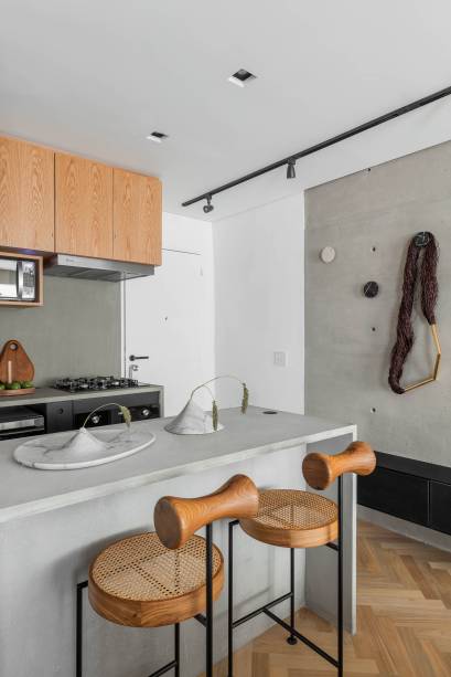 Como o morador recebe muitos amigos, a arquiteta Mona Singal optou por criar uma área social com o máximo conforto. A cozinha foi integrada com a área de estar e as banquetas Iaiá de Gustavo Bittencourt são o suporte para as refeições rápidas do dia a dia e para acomodar as visitas enquanto a comida é preparada.