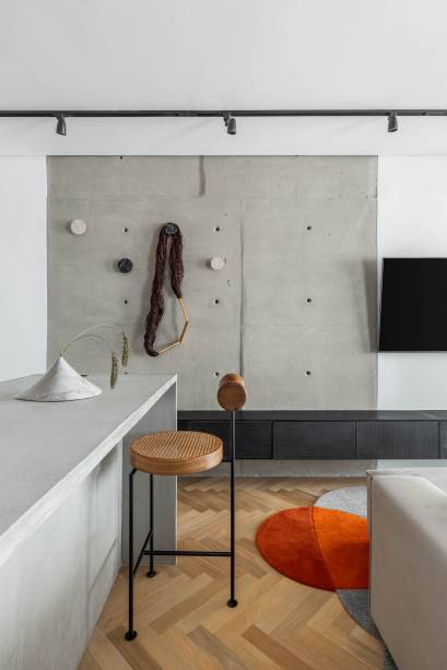 Na área social, foi descascada a estrutura em concreto para deixá-la aparente, pilares e viga. A frieza do concreto cria um contraponto com o aconchego do piso em madeira tauari na paginação espinha de peixe.