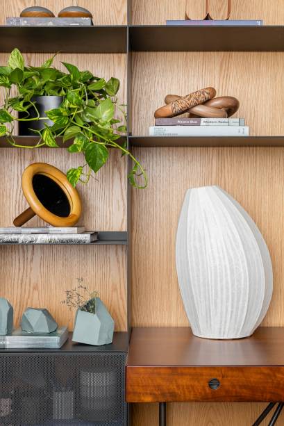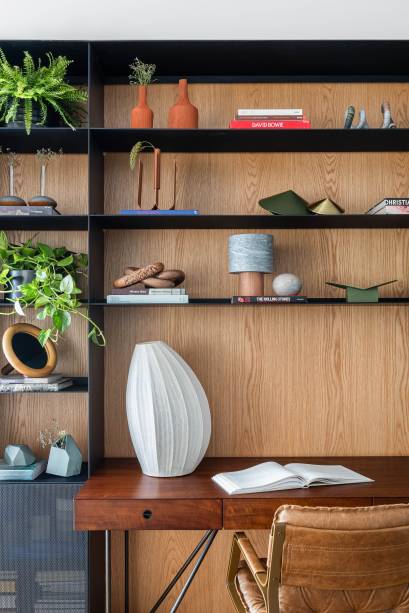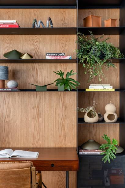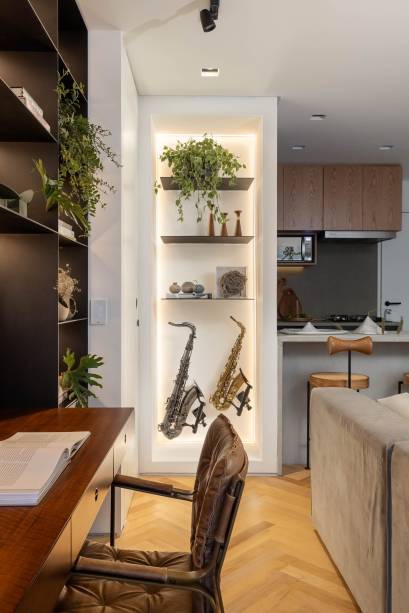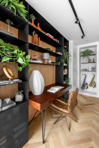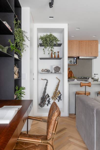 A área de trabalho fica nesse mesmo espaço, demarcada por uma estante em serralheria e madeira natural carvalho com a escrivaninha Quilombo de Arthur Casas. Ao lado, em destaque, estão os saxofones em um lugar que foi desenhado especialmente para eles, com iluminação e prateleiras em serralheria.