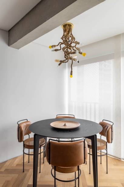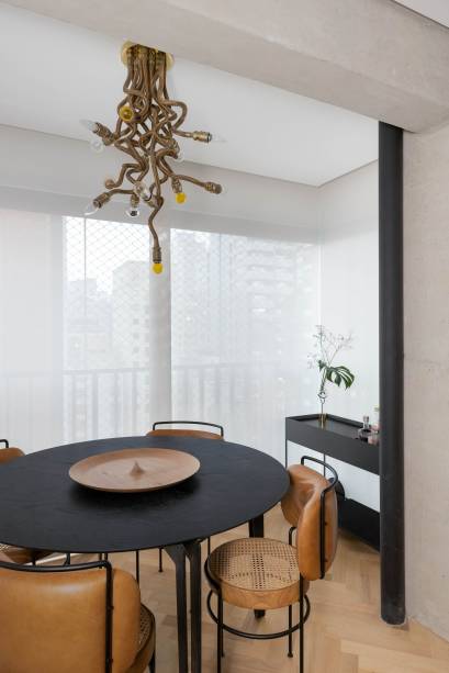 O terraço foi integrado com a área social, nivelando o piso externo e fazendo o fechamento de vidro para acomodar o jantar. A mesa Bank do Jader Almeida e as cadeiras Iaiá de Gustavo Bitencourt compõem com o lustre Medusa da 80e8, desenvolvido com tubulação de gás, como uma obra de arte modelada. Aliás, essa foi a primeira peça escolhida para o projeto.