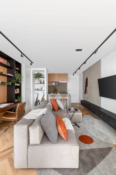 Os principais pedidos do cliente eram que o apartamento fosse um refúgio, onde pudesse descansar, mas que também fosse um local de trabalho remoto. Apaixonado por música, seu hobby é tocar saxofone e o lugar para esse instrumento deveria ser pensado com muito carinho.