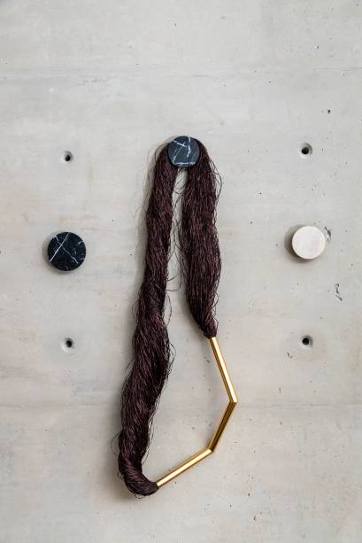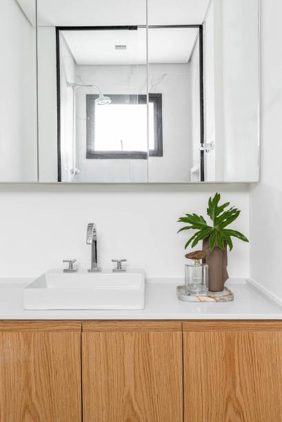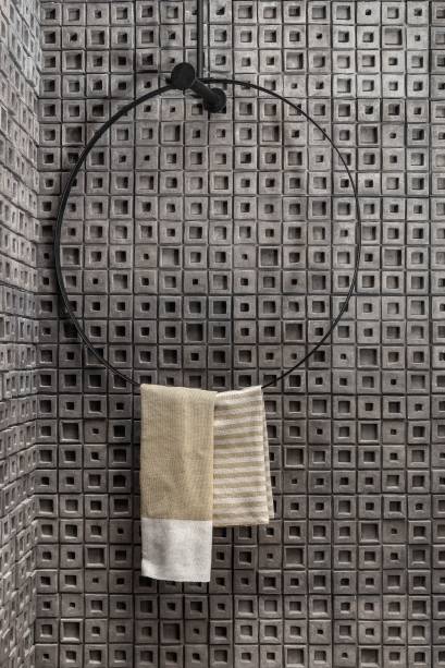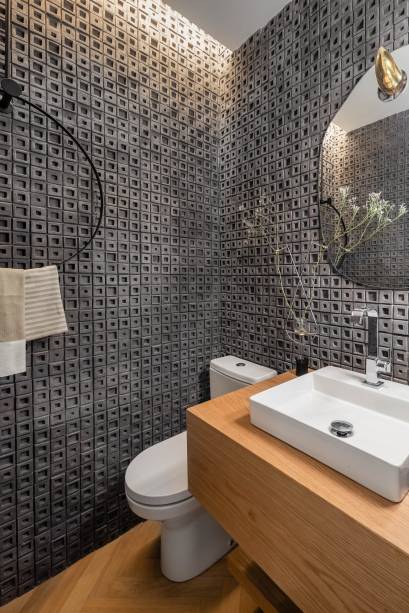 O pequeno lavabo é o cartão de visitas do apartamento. Um cubo com revestimento em concreto com relevo geométrico da Gauss e elementos de designers brasileiros, como o cabideiro Argola do Wentz, arandela Jabuticaba de Ana Neute e o espelho Rino do Estudio Orth, criam uma atmosfera inesperada para as visitas.
