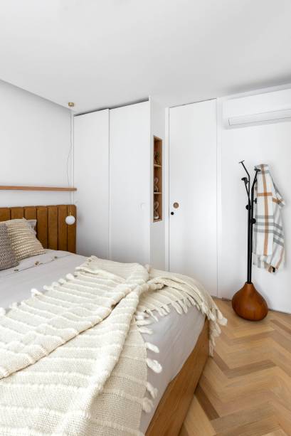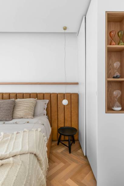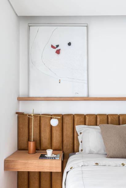 Já na suíte master, foi criada uma linguagem sofisticada usando materiais naturais. O escritório desenhou a cabeceira em couro, cama com gavetões e mesa lateral em madeira carvalho.