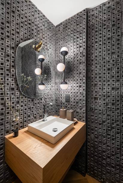 Lavabo de apê de 58 m² é cubo em concreto com relevo geométrico