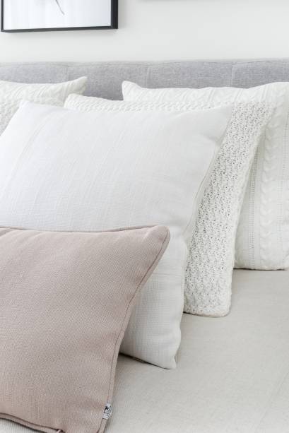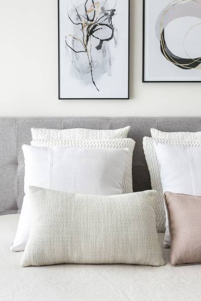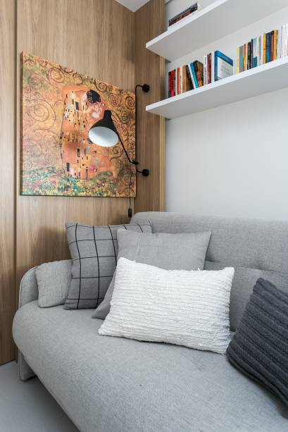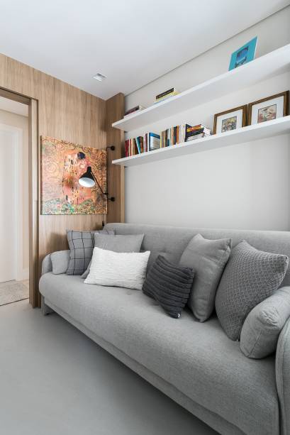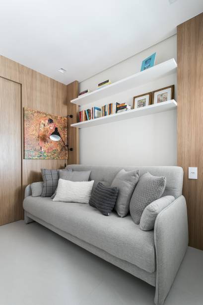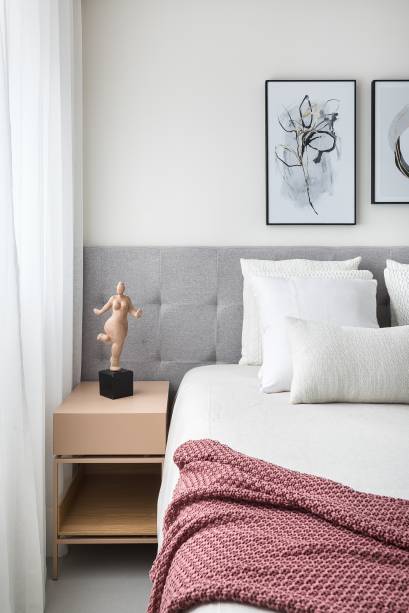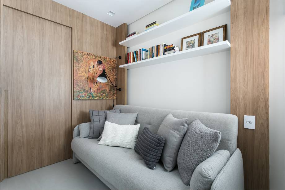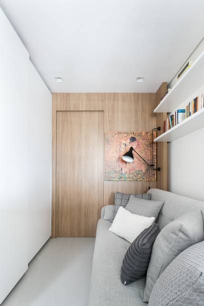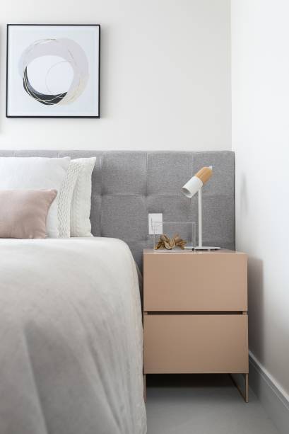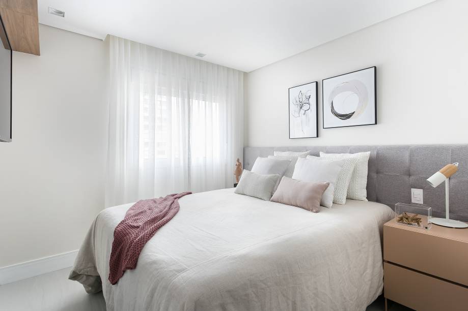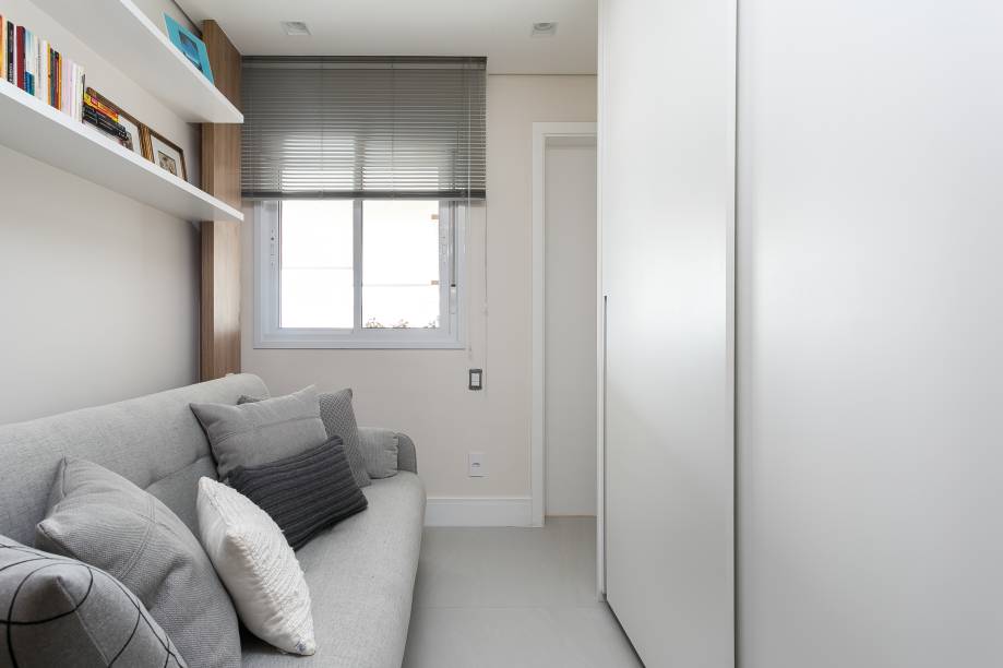 O quarto de hóspedes recebeu bastante atenção. Ele possui um grande armário, sofá que funciona como ponto de leitura e também como sofá cama e prateleiras para expor livros. A suíte master é um local de descanso e relaxamento, portanto, recebeu um décor claro, cabeceira estofada e mesinhas laterais delicadas.