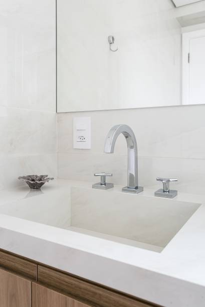 Para o banheiro da suíte, foi utilizado um revestimento marmorizado branco com veios acinzentados. O espelho reveste armários aéreos, podendo funcionar como espaço de armazenamento funcional mas sem perder a beleza.
