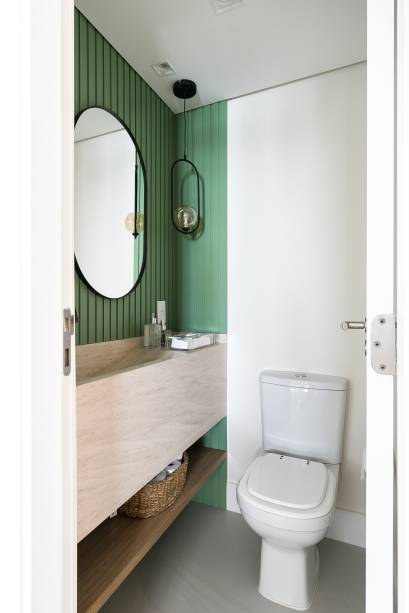 O lavabo é um ponto focal do projeto. A arquiteta conta que ele foi concebido de forma mais “teatral”, com um painel verde e um espelho com arandela em serralheria preta. Para finalizar, foi acrescentado uma bancada esculpida com cuba inclinada.