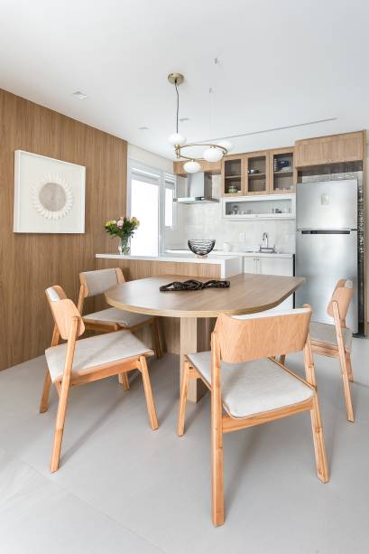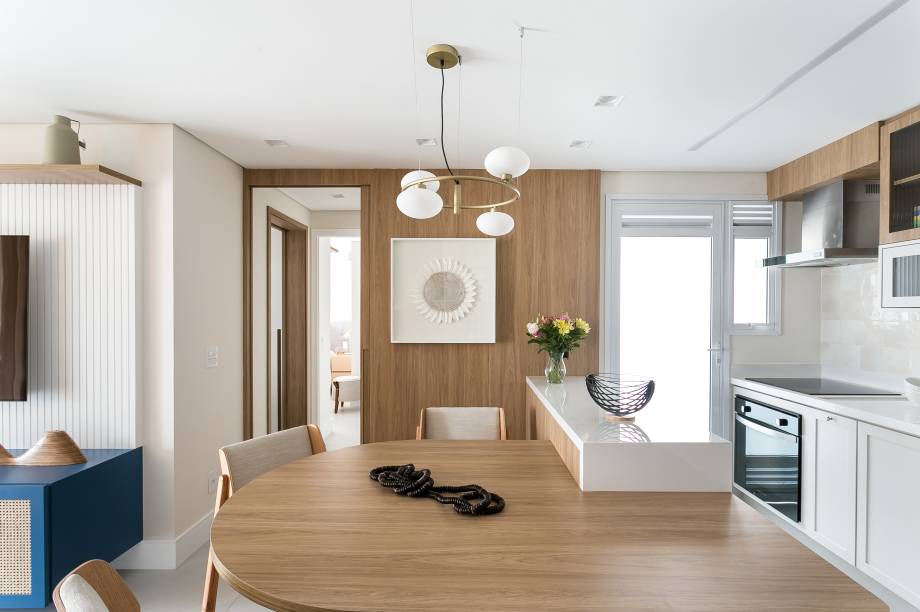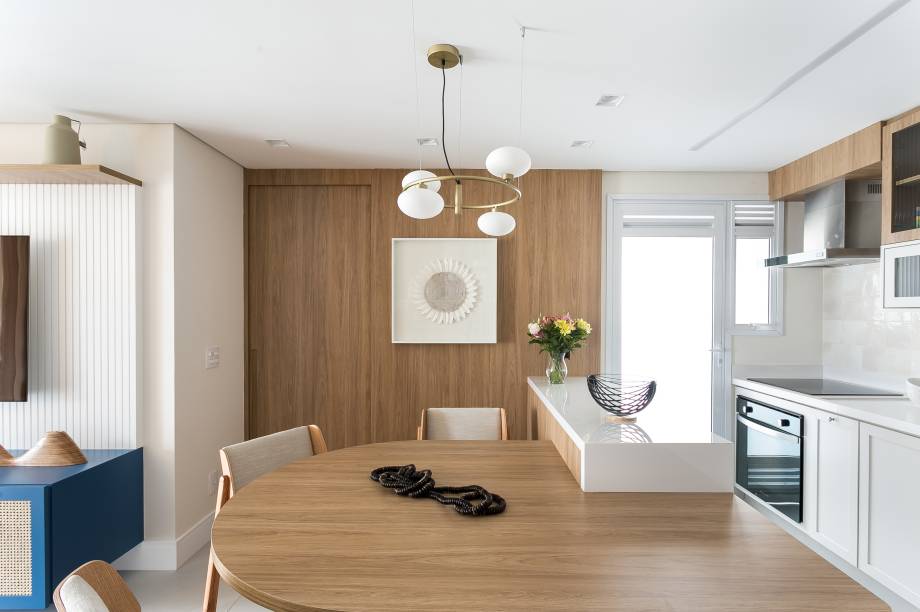 A profissional conta que o ponto de partida foi a integração entre a sala e a cozinha, de forma a garantir um bom espaço de armazenamento e também uma mesa para refeições. Como essa peça atrapalharia a circulação, a solução foi desenhar uma mesa especialmente para o apartamento com um formato orgânico, que se encaixa perfeitamente no ambiente.