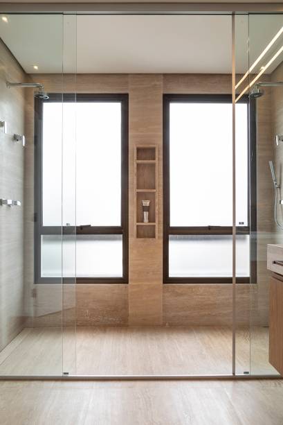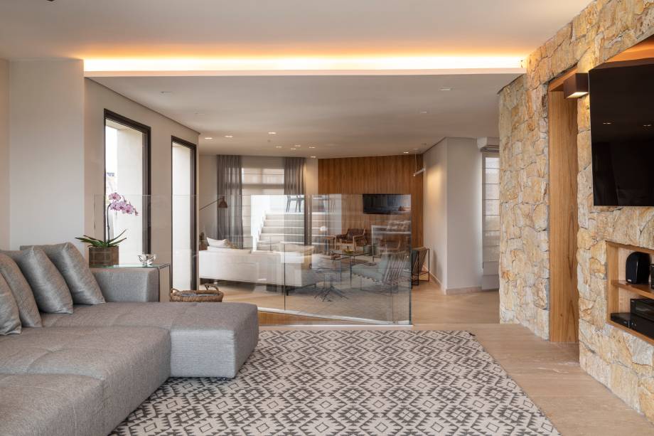 Através de uma escada envelopada com mármore travertino e com um guarda corpo todo de vidro, Camila e Thatiana desenharam a área social constituída por um living, home theater, sala de jantar, cozinha e um terraço aberto que leva à piscina.