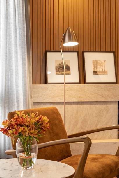 Entre as escolhas que pautaram a reforma, a madeira aparece como ponto focal com a lâmina natural de freijó, que reveste paredes e parte do mobiliário do apartamento. Na proposta do décor estão tons sóbrios e contemporâneos, evidenciando um contraste com as tonalidades de madeira.