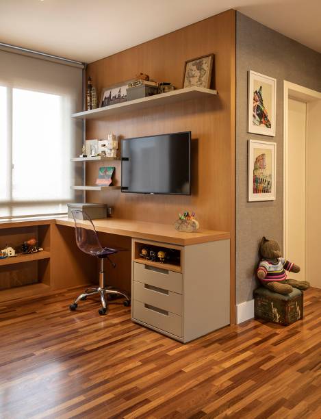 Na sequência do andar estão situados as suítes dos dois adolescentes. O freijó forma a marcenaria do painel da televisão, a escrivaninha para as atividades escolares e a continuidade que formam os dois nichos para expor a coleção de brinquedos e a cabeceira.