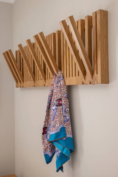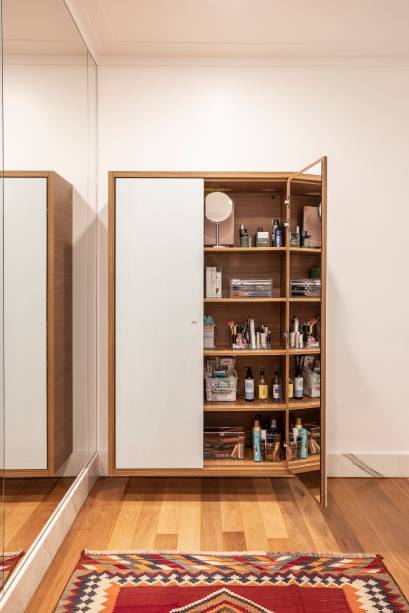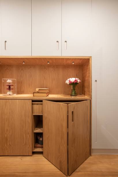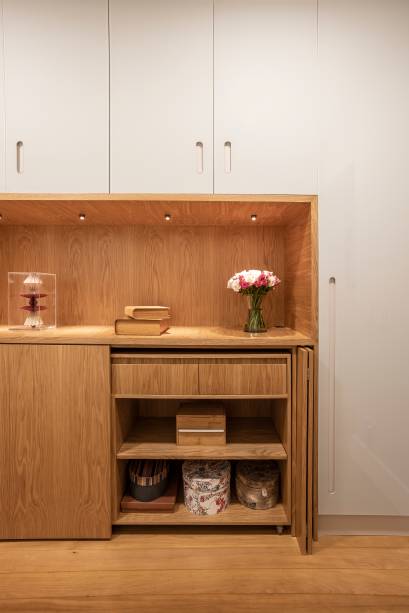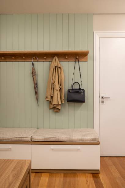 O projeto também inclui peças de mobiliário exclusivas, como um aparador, banco e cabide de bolsas, projetados pelo escritório de arquitetura para atender às necessidades específicas dos clientes.