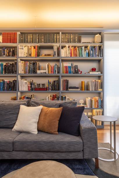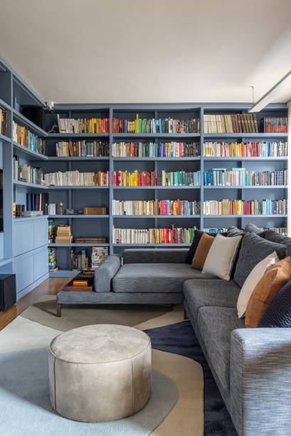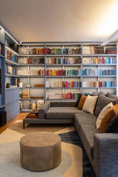 Destacando-se como uma obra de arte por si só, a grande coleção de livros da família foi acomodada de maneira harmoniosa e visualmente impactante nas novas marcenarias. A cliente teve a oportunidade de organizar todos os títulos por assunto e cores, criando um efeito de cores cativante com as lombadas das capas.