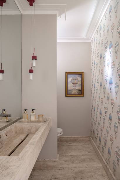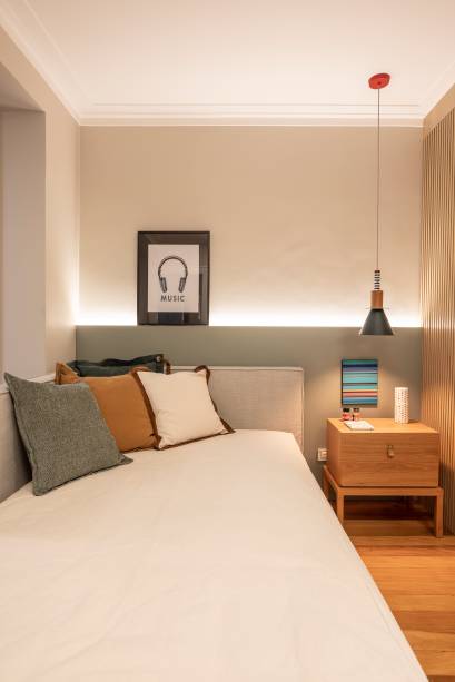 No Home Theater, o acabamento em laca em um tom de azul acinzentado trouxe um toque despojado. Pontos de cor foram aplicados no hall íntimo e na suíte do filho para criar um contraste visual.