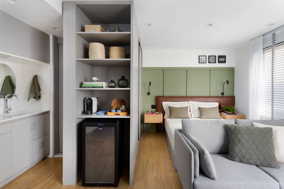 Um móvel multifuncional acomoda as duas necessidades separadas, ampliando o imóvel e tornando possível a adição de um bar com um frigobar.
