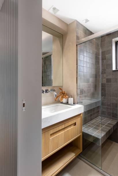 Como este último espaço era muito pequeno e o banheiro do casal muito grande, o escritório optou por desenvolver uma solução prática, separando o vaso sanitário e o chuveiro e integrando a pia com a bancada da copa.