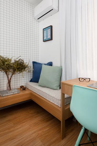 E a iluminação embutida no perfil de gesso e um móvel linear, que funciona como mesa lateral, banco e escrivaninha, no quarto de solteiro, também oferecem originalidade.