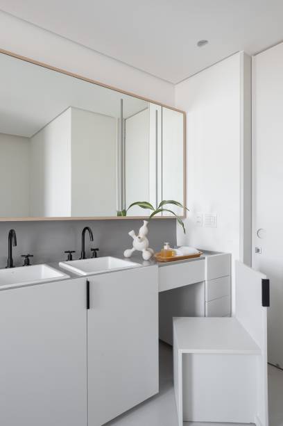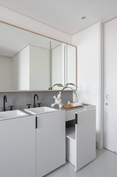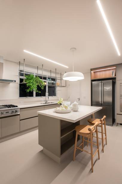 No andar de baixo, fica a parte mais íntima. Além dos quartos e cozinha, ali ficam mais um home office, uma área para refeições e um espaço para as crianças brincarem. No dormitório do casal está o closet, banheiro e também uma bancada de maquiagem.