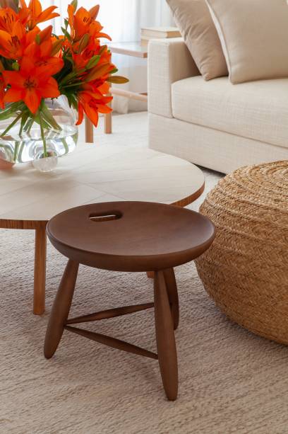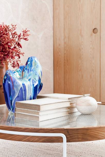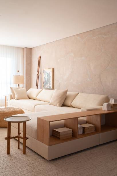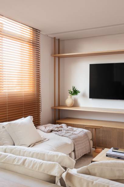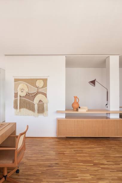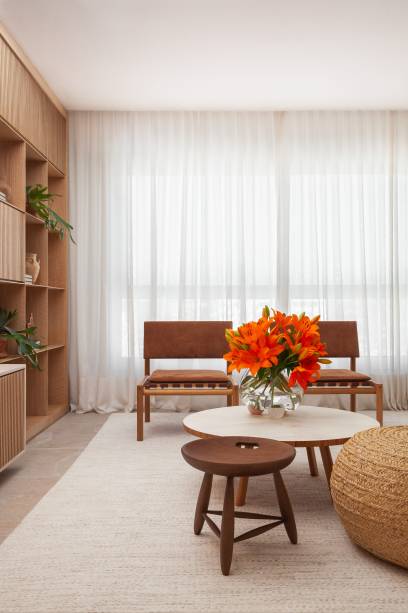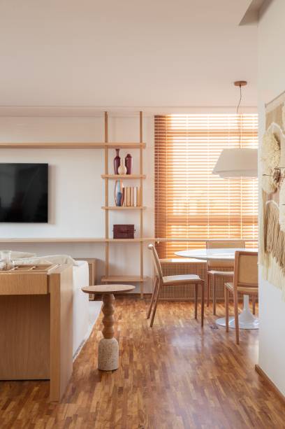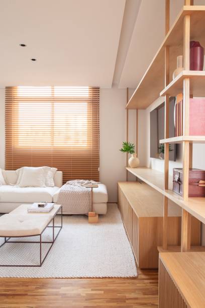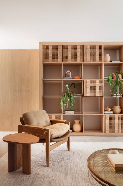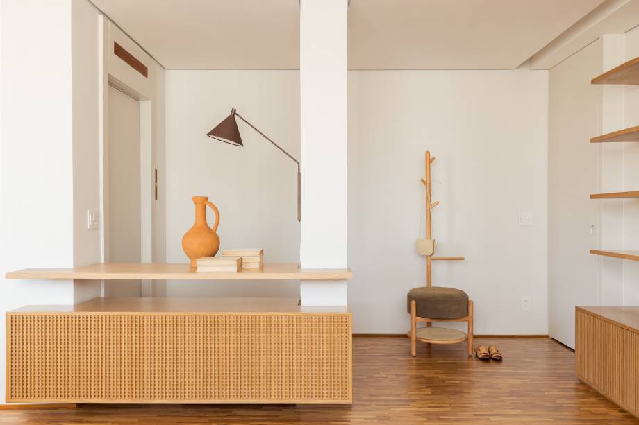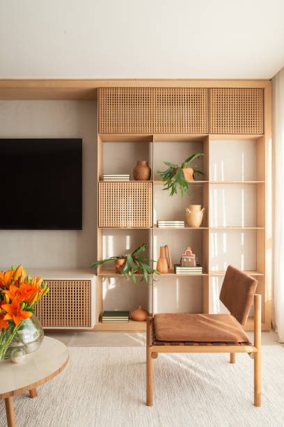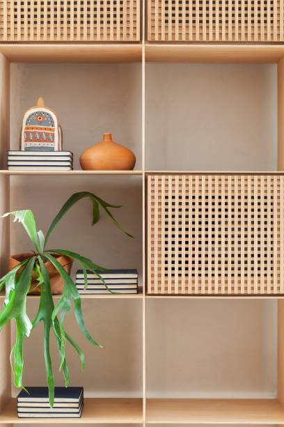 A marcenaria é o grande destaque da área social. Na sala, uma estante com nichos e detalhes em muxarabi atravessa a parede inteira.