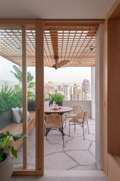 Marcenaria leve com muxarabis é destaque nesta cobertura de 300m²