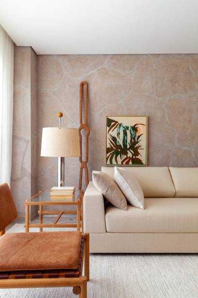 O piso de porcelanato em formato orgânico – criado pelos profissionais para a Colormix – dá a unidade visual do apartamento. “Esse revestimento sobe na parede do fundo, trabalhamos muito esses planos paralelos, de um lado a estante e do outro a parede de pedra”.