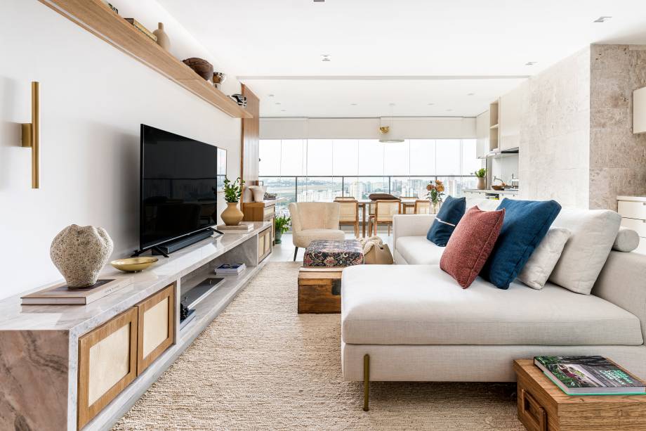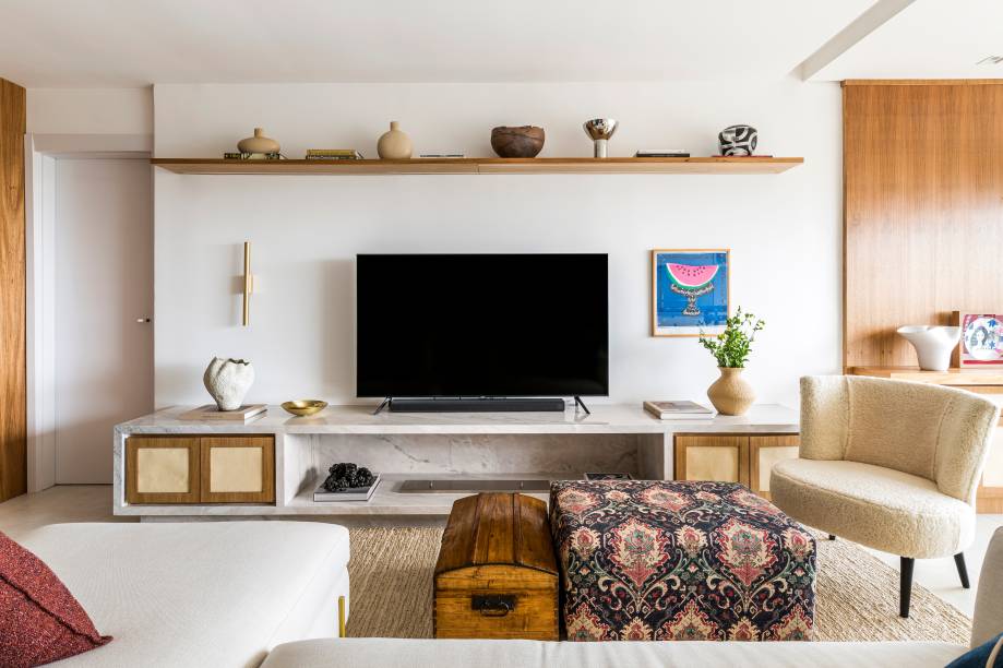 Na sala, o destaque fica para o móvel do home theater. “Projetamos uma grande estrutura em mármore branco Paraná, onde centralizamos a lareira e, nas extremidades, inserimos armários de madeira com portas em palhinha natural. A mistura de elementos resultou em uma composição perfeitamente harmoniosa”, afirma Vivi.