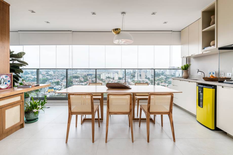 Destaque para o grande quadro colorido e a arandela próxima à bancada de refeições. Para reforçar a integração, já solicitada à construtora na fase de construção, a cozinha também recebeu marcenaria feita em folha de madeira natural.