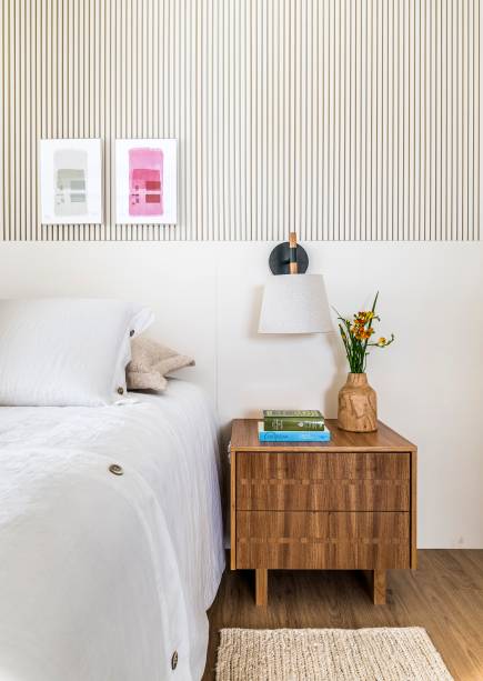 No quarto do casal, a mudança de posição da porta do banheiro, originalmente em frente à cama, abriu espaço para o painel ripado. “Essa mudança também foi energeticamente positiva, pois segundo o feng-shui a cama não deve estar em frente à porta do banheiro”, explica a arquiteta.