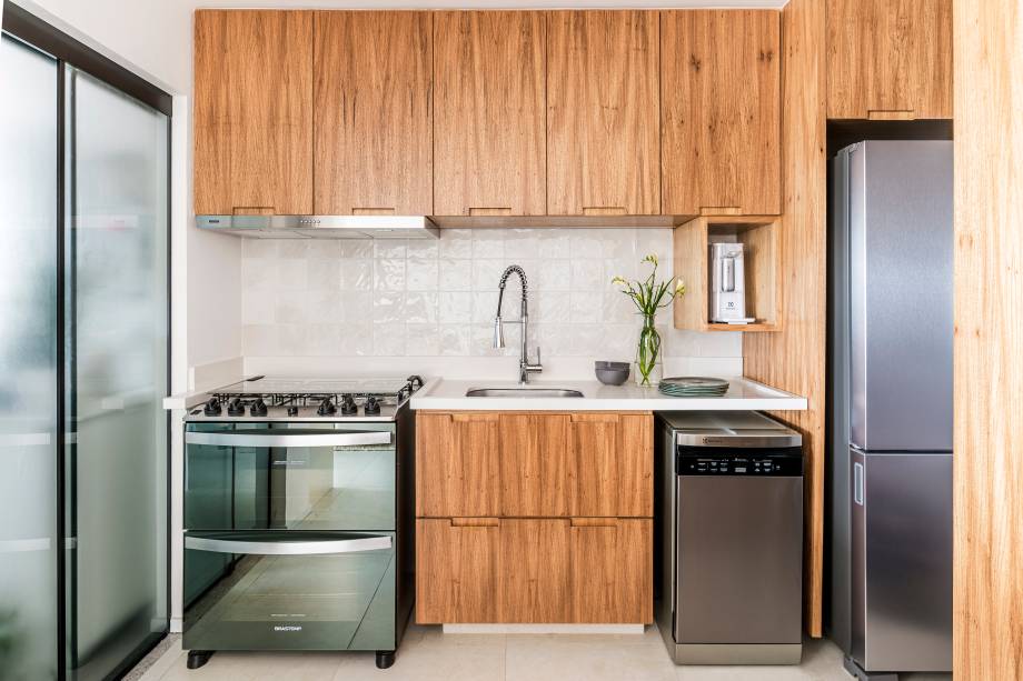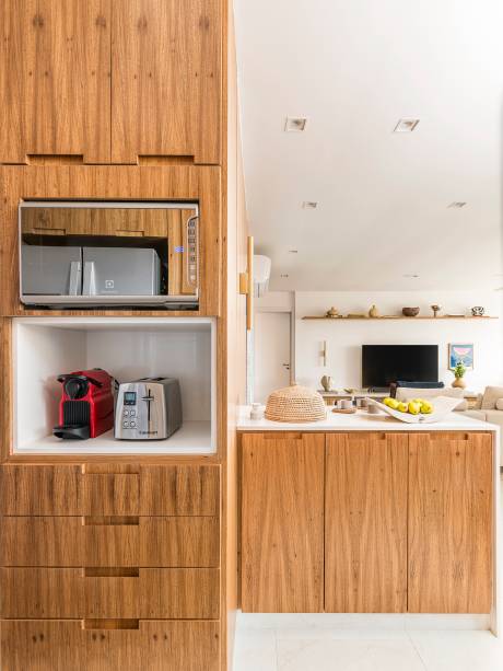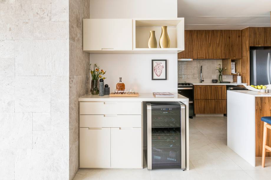 Destaque para o grande quadro colorido e a arandela próxima à bancada de refeições. Para reforçar a integração, já solicitada à construtora na fase de construção, a cozinha também recebeu marcenaria feita em folha de madeira natural.