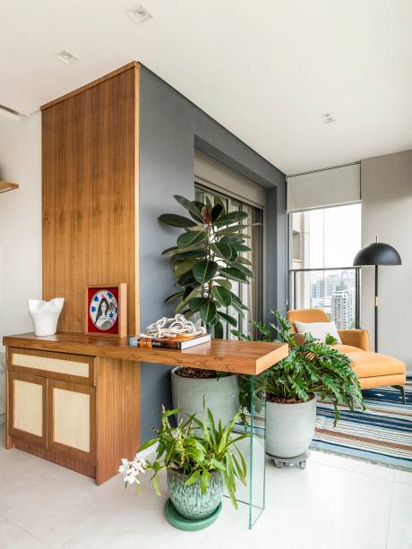 Com a eliminação da varanda social, a varanda da suíte ligava diretamente à sala. Para maior privacidade, foi desenhado um aparador que, junto a vasos de plantas, delimita as duas áreas.