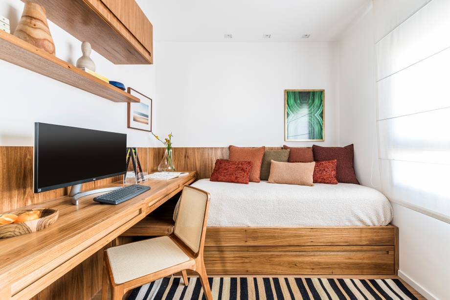No quarto do casal, a mudança de posição da porta do banheiro, originalmente em frente à cama, abriu espaço para o painel ripado. “Essa mudança também foi energeticamente positiva, pois segundo o feng-shui a cama não deve estar em frente à porta do banheiro”, explica a arquiteta.