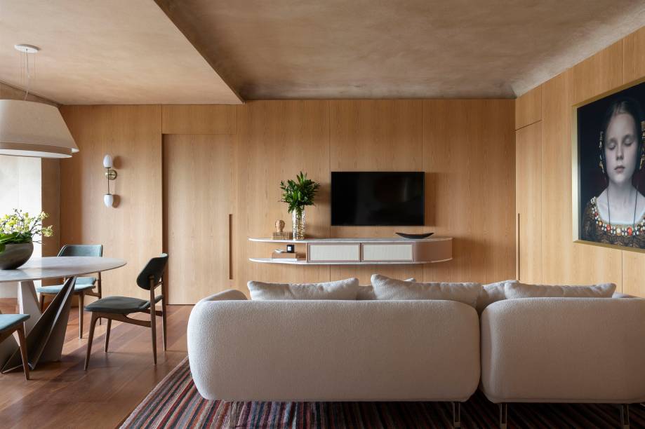 Na decoração da sala, a arquiteta revestiu as duas paredes principais com painéis de carvalho americano natural (que mimetizam portas de acesso a outros cômodos) e mesclou elementos em tons terracota, verde escuro, vinho e fendi com peças douradas para acrescentar um toque de modernidade.