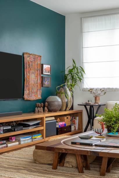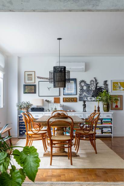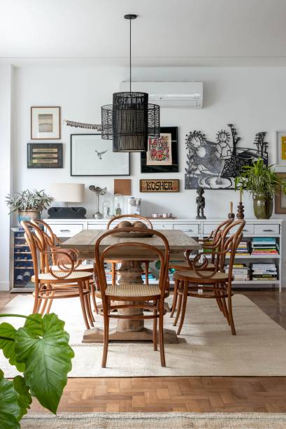 O apartamento é inteiro assim: uma grande miscelânea de móveis e peças garimpadas ao longo dos anos pela família: mesa de jantar, carrinho de bar, pufes, luminárias, caixas, cachepots… Tradicionais sinos balineses decoram o hall de entrada. Na cozinha, as latas antigas de mantimentos foram garimpadas em um mercado de pulgas no Brooklin (Nova York). E as mantas trazidas do Atacama hoje enfeitam o sofá em conjunto com as almofadas forradas com tecidos da Indonésia.