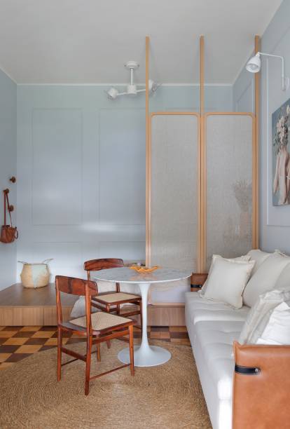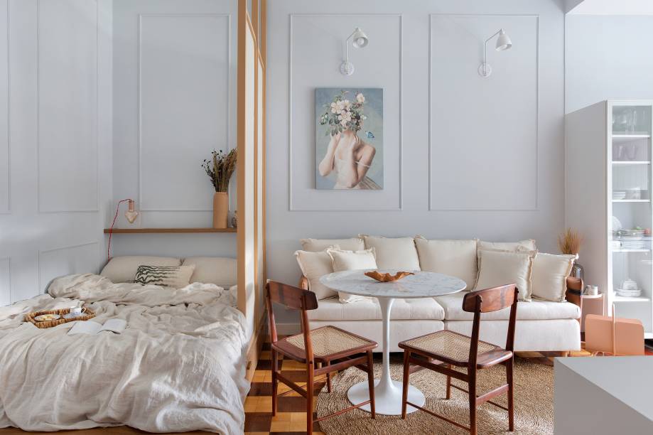 Já no quesito “acabamentos”, foram priorizados materiais naturais, como linho, algodão, madeira, couro e fibra. Outro destaque é a área da cama-tablado (com gavetas embaixo) que se estende por toda a parede da sala, separada do estar por uma charmosa divisória de ferro, madeira e linho, desenhada pela própria arquiteta.
