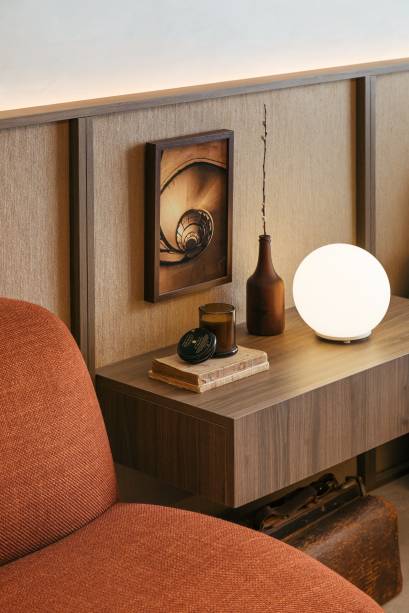 No quesito “materiais e acabamentos”, as paredes e o teto receberam textura em tom areia (da I Colori di Venezia), a marcenaria (executada pela DellAnno) tem acabamento em melamina no padrão nogueira (de tom quente, com fundo avermelhado), o painel com função de cabeceira da cama (que se estende atrás do sofá) foi executado em madeira forrada em tecido de fibra natural e a cortina e a roupa de cama foram confeccionadas com em linho cru.