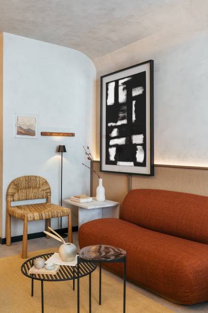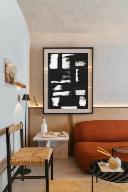 No geral, materiais naturais em tons terrosos e minerais predominam no projeto, que segue o estilo contemporâneo, com forte influência do wabi sabi – um conceito cativante que nos ajuda ver beleza na imperfeição, apreciando a simplicidade e a transitoriedade natural de todas as coisas. “Existe uma certa ancestralidade nas texturas da madeira, da palha, do barro e dos elementos minerais. A ideia foi revisitar nossas origens através desses materiais, trazendo uma interpretação leve contemporânea a partir peças com design acessível e arte”, informa Leandro.