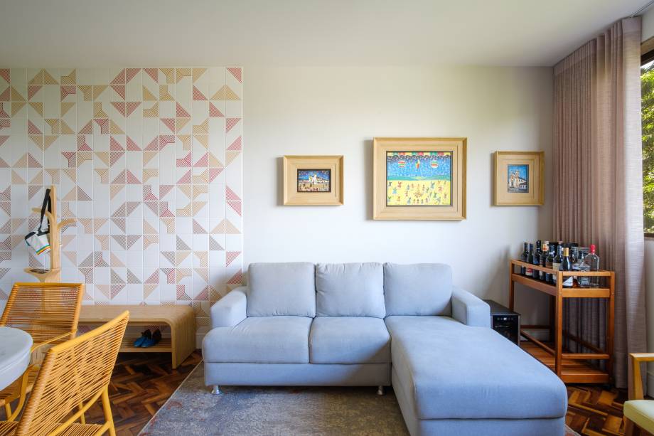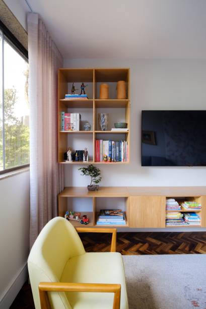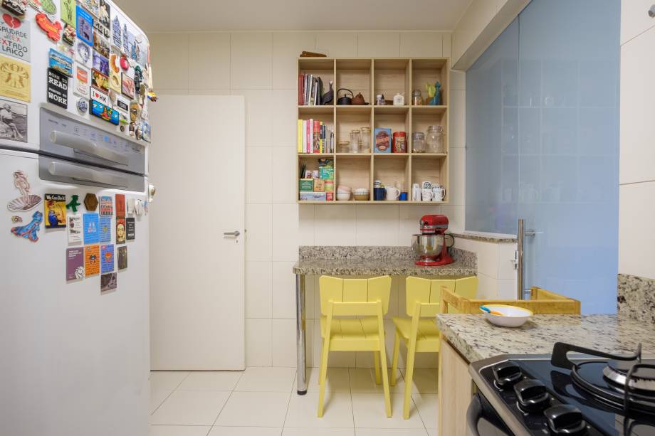 Uma estante adicional, confeccionada em compensado naval – um material robusto em sua forma bruta – reflete a personalidade dos moradores. Além disso, azulejos especialmente produzidos em Brasília para este apartamento trazem identidade.