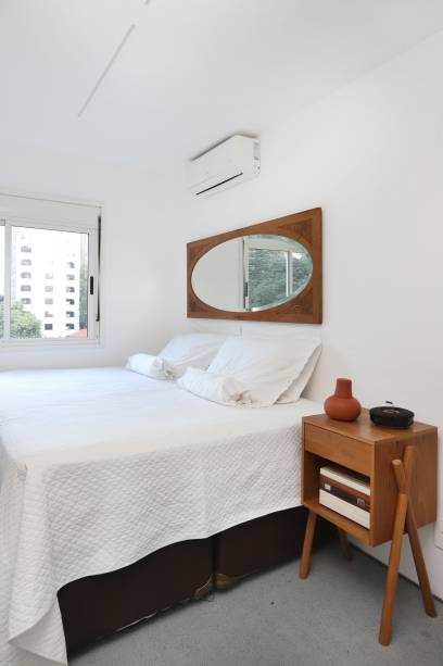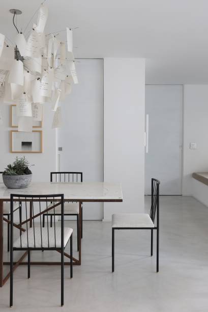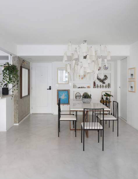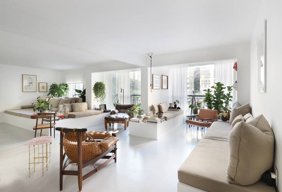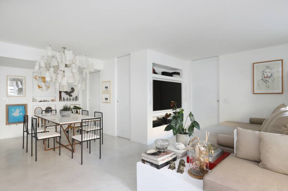 Para isso, o arquiteto optou por utilizar diversos móveis feitos de alvenaria, que criaram uma base neutra para as peças de design que a moradora já possuía.